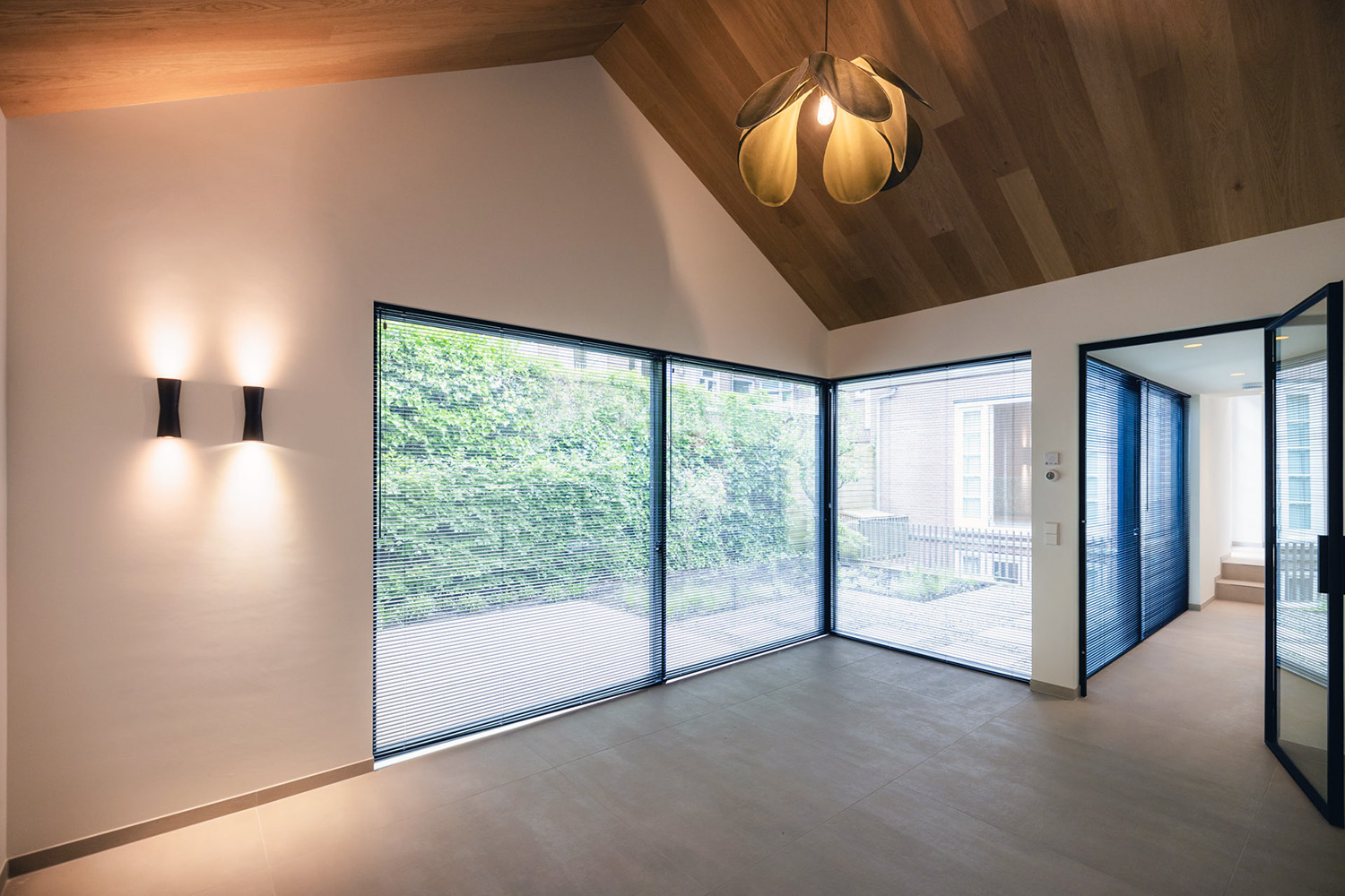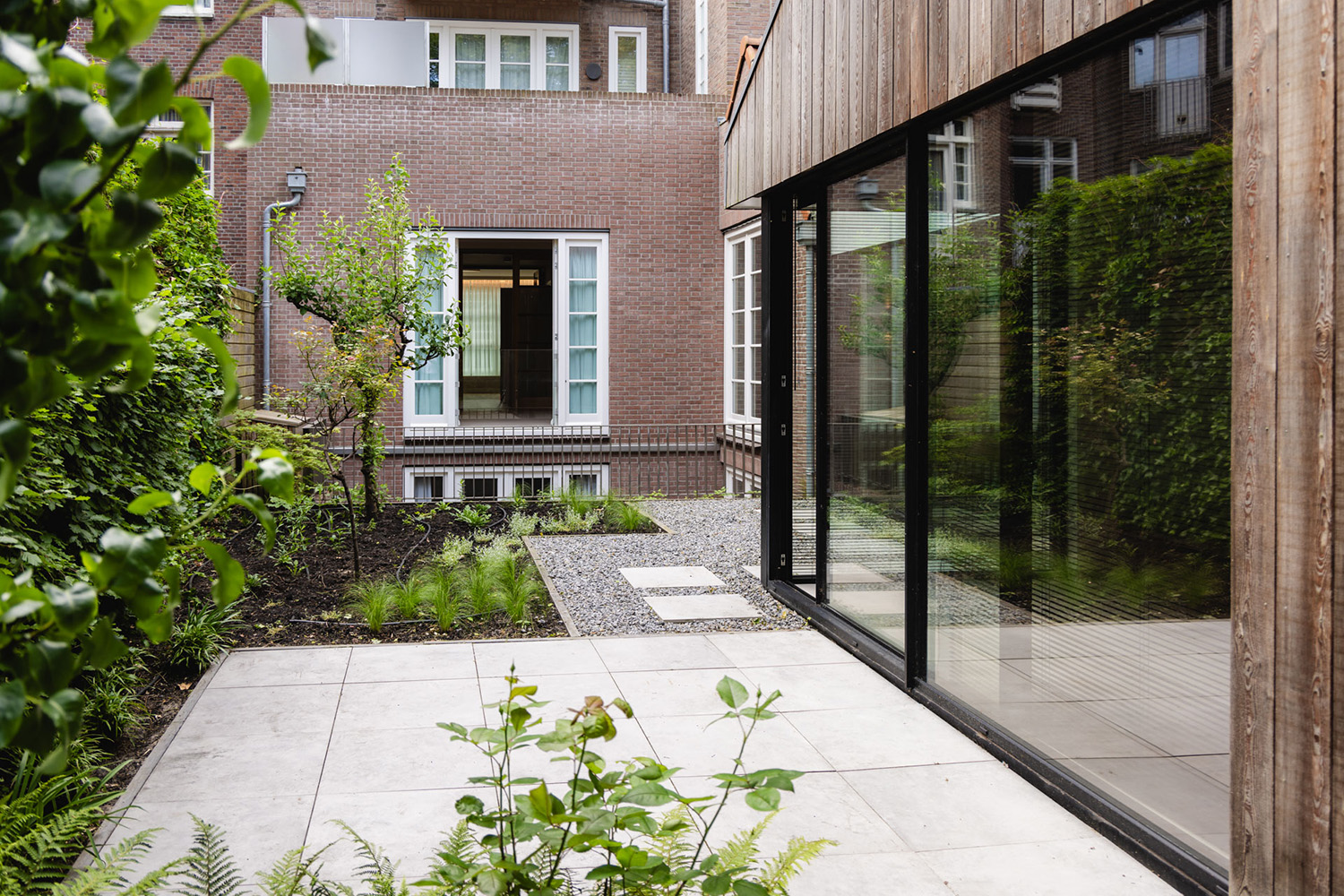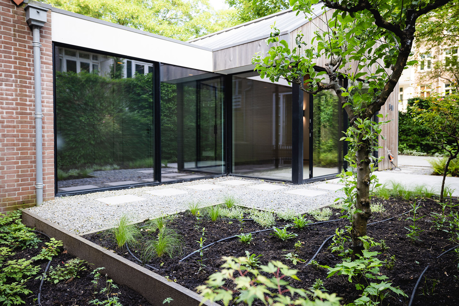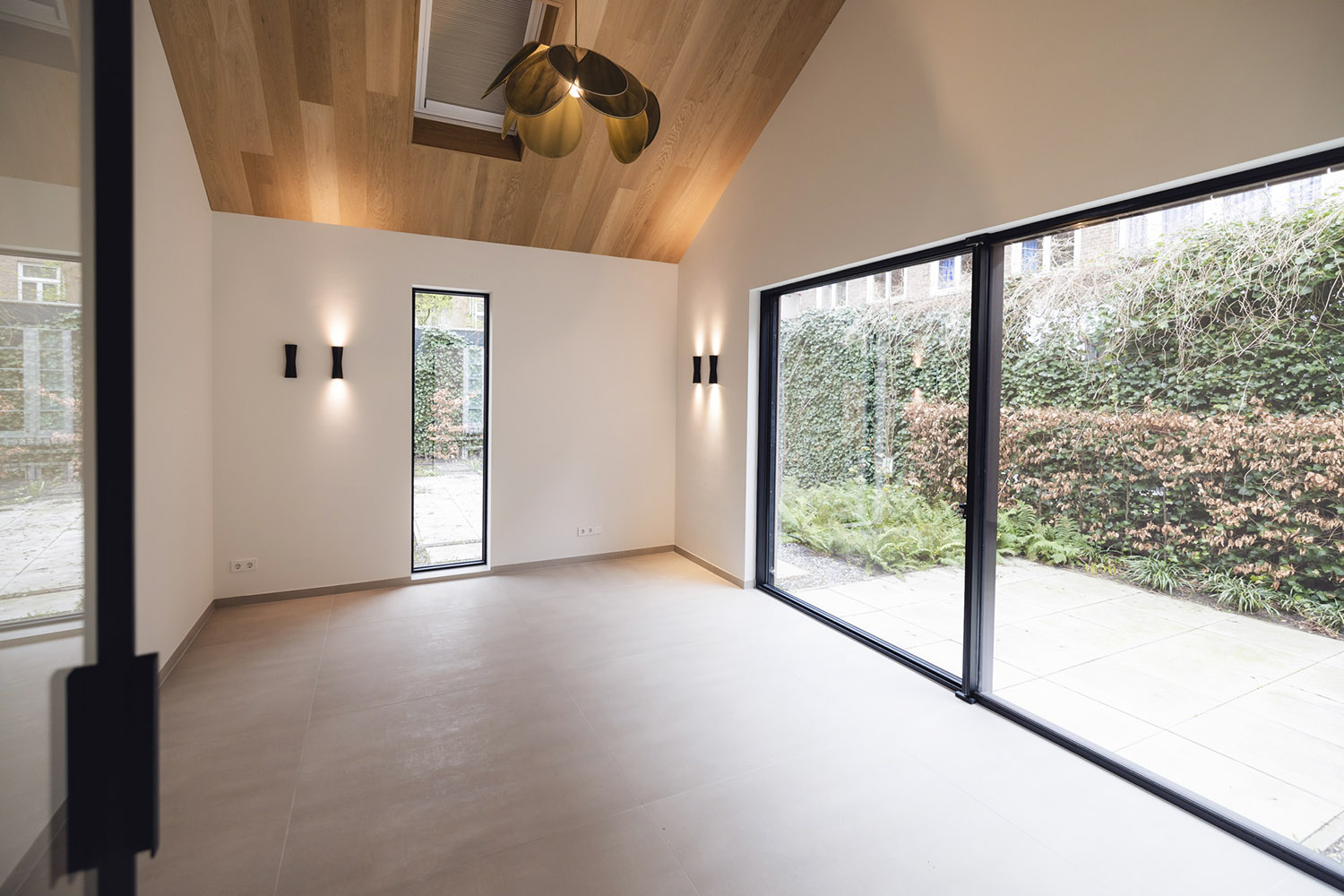 In contrast to the main building, the garden house is built in a modern, minimalist style, with a roof and rear facade in zinc, side walls of Red Cedar wood and Tudor glass sliding doors.