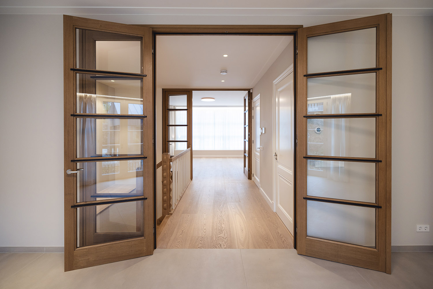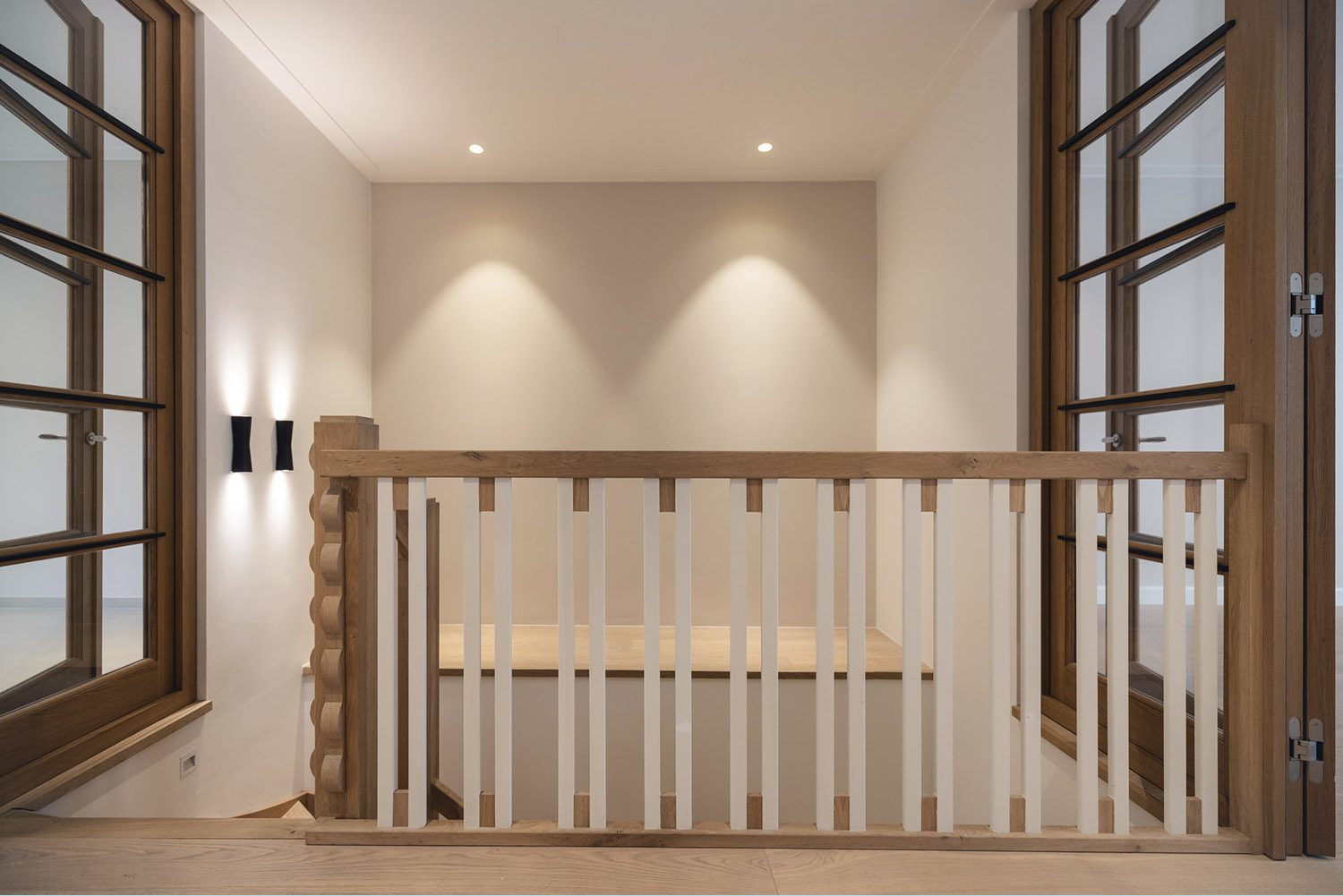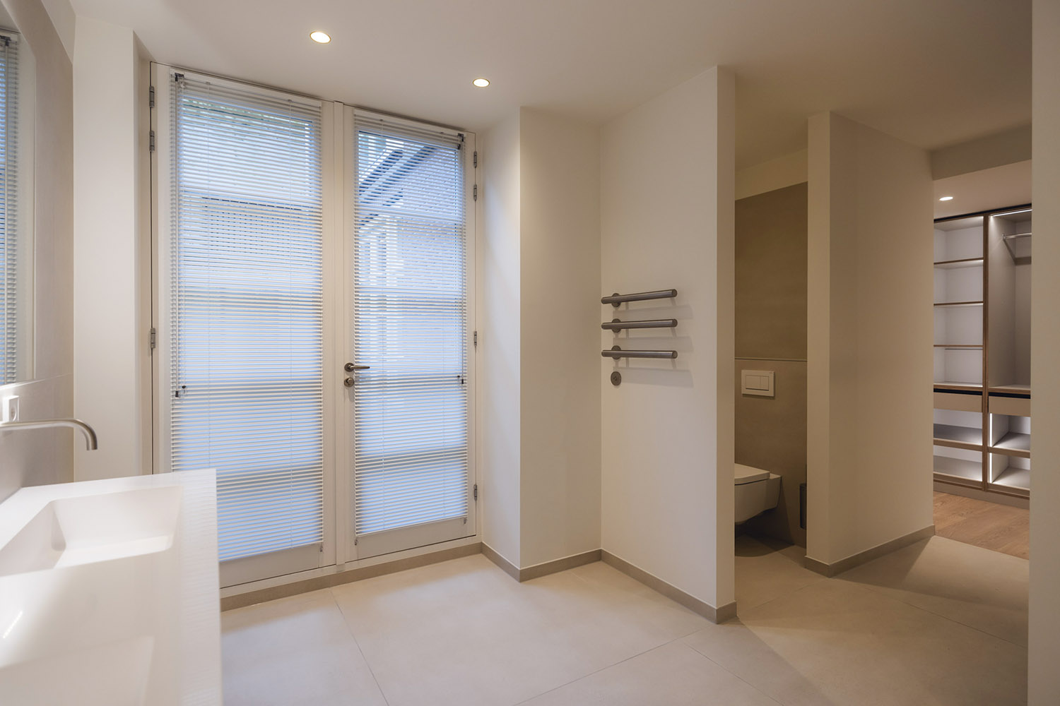 The wooden staircase with beautiful details leads to the sleeping area with high ceilings. At the rear of the apartment the Master bedroom with walk-in closet is situated. This bedroom has a large en-suite bathroom with rain shower and wonderful freestanding soaking bathtub. All three bathrooms have toilets and ceramic tiles of Gigacar, Monolith wash basin tops and custom made cabinetry. Both the Master bedroom and bathroom have french doors that open to a deepened terrace.