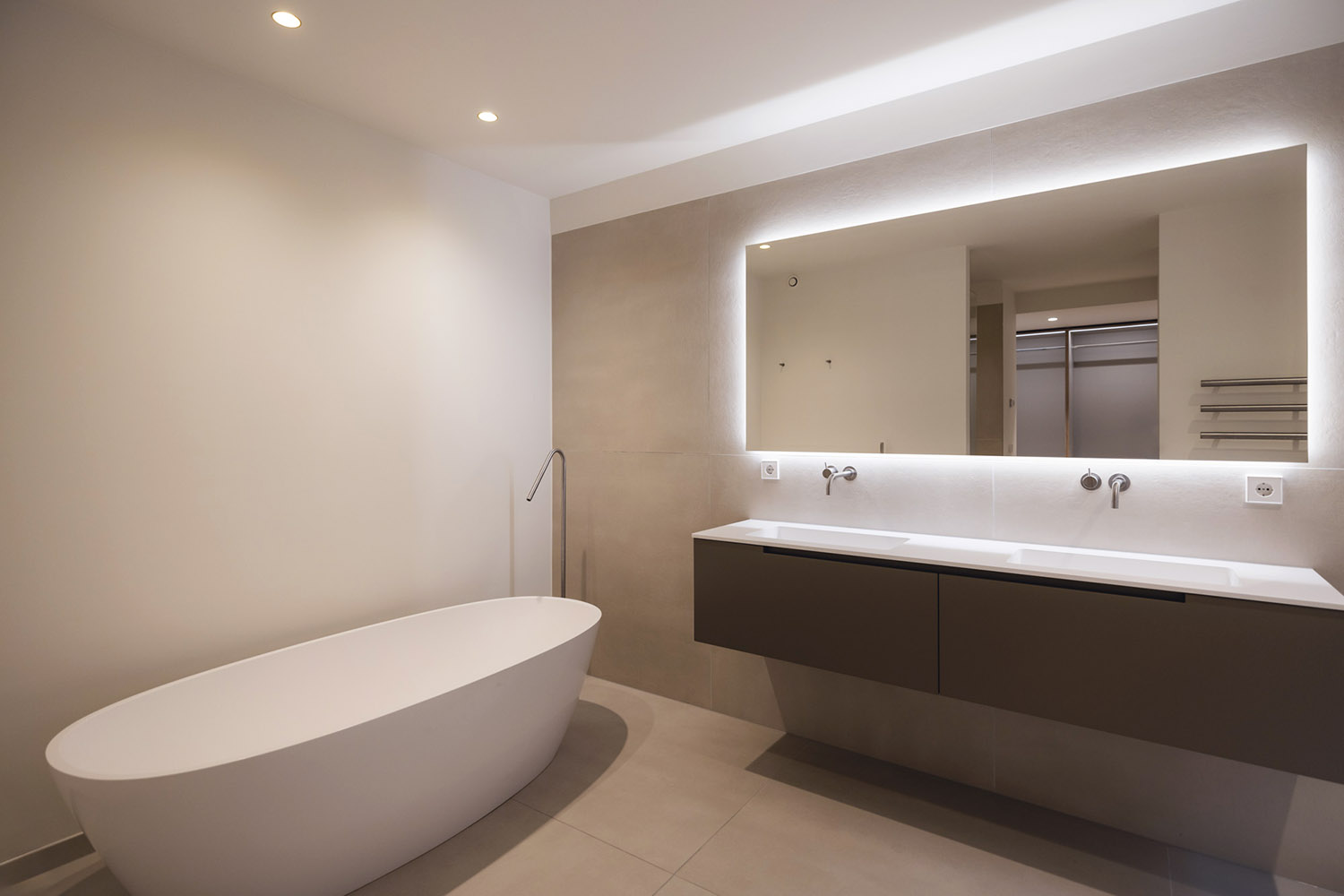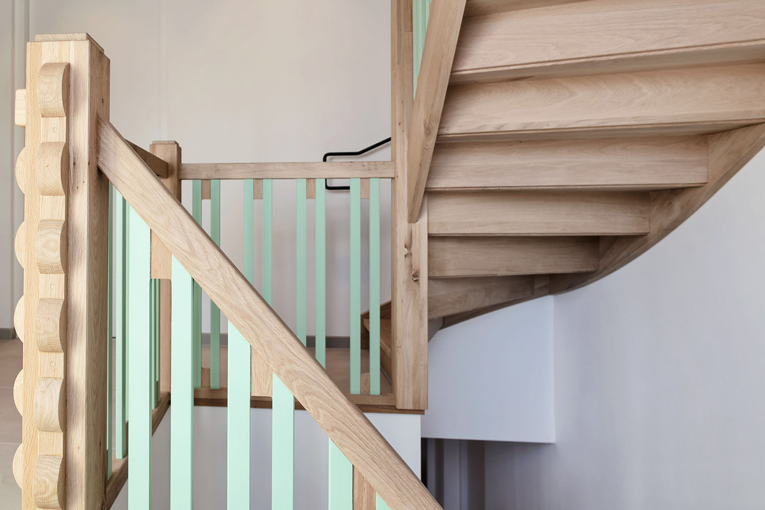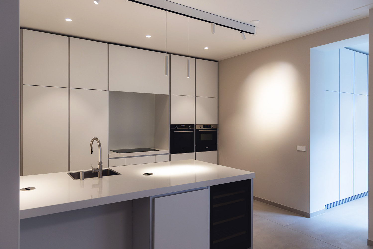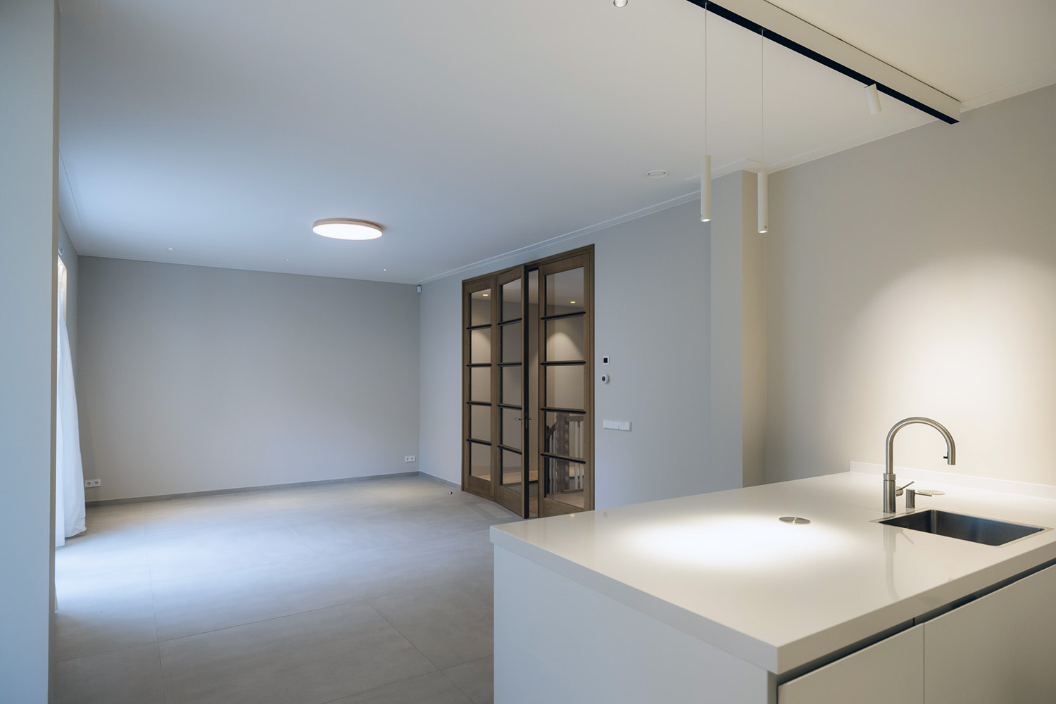 The wooden staircase with beautiful details leads to the sleeping area with high ceilings. At the rear of the apartment the Master bedroom with walk-in closet is situated. This bedroom has a large en-suite bathroom with rain shower and wonderful freestanding soaking bathtub. All three bathrooms have toilets and ceramic tiles of Gigacar, Monolith wash basin tops and custom made cabinetry. Both the Master bedroom and bathroom have french doors that open to a deepened terrace.