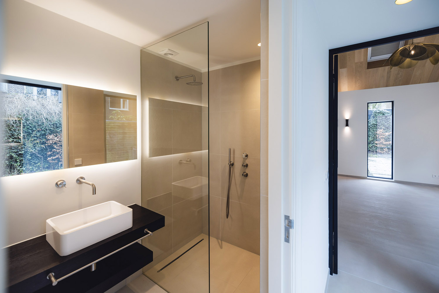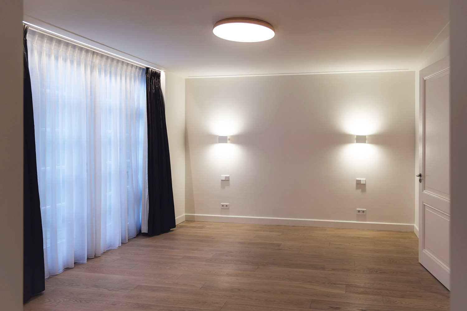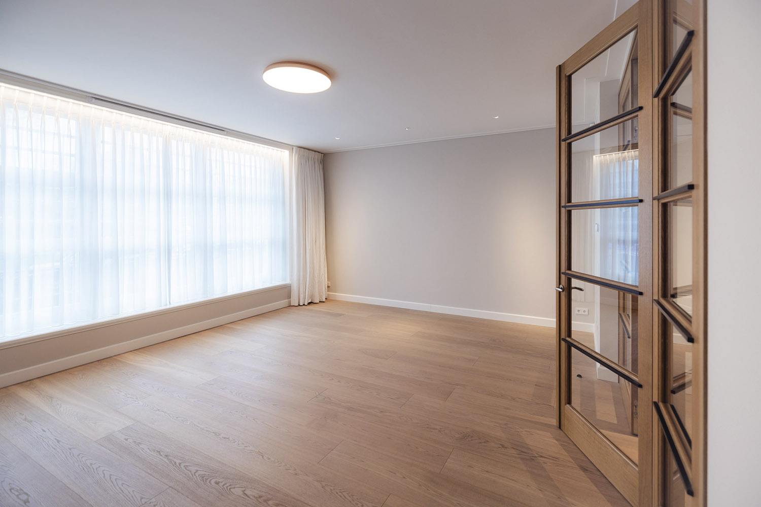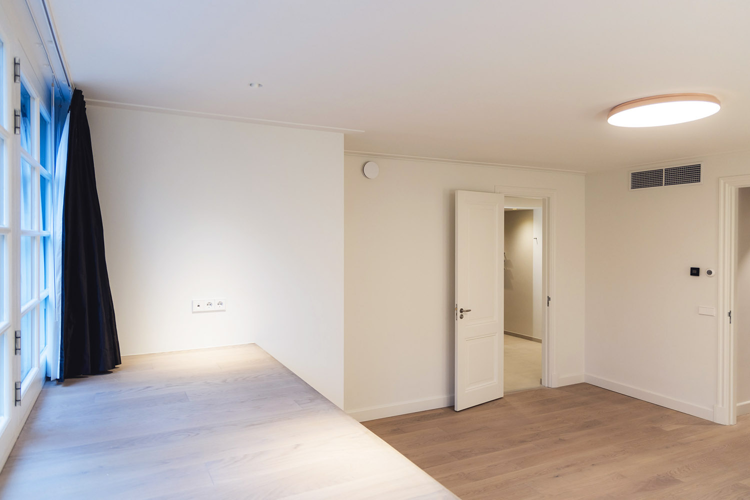 At the front side of the apartment the second bedroom is located. This room is wonderfully light due to the high ceilings and wall of windows. It also features an en-suite bathroom with rain shower, toilet and wash basin. Furthermore on this floor a storage room and laundry room with washing machine and dryer can be found.