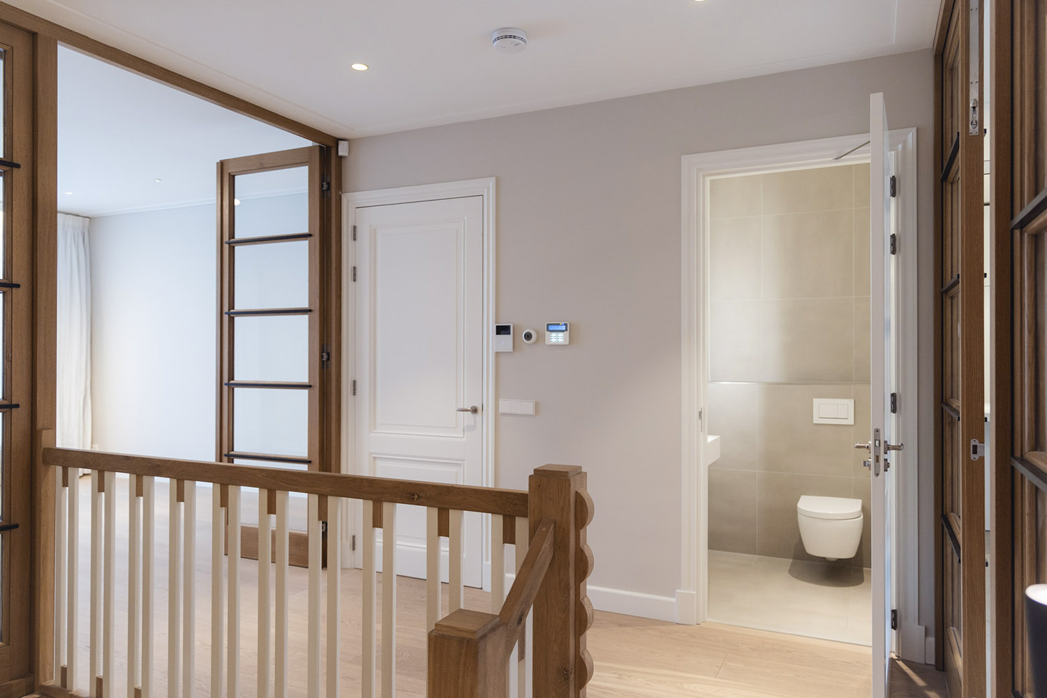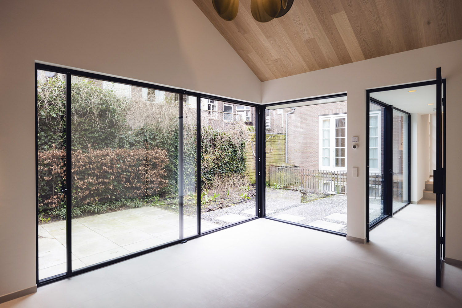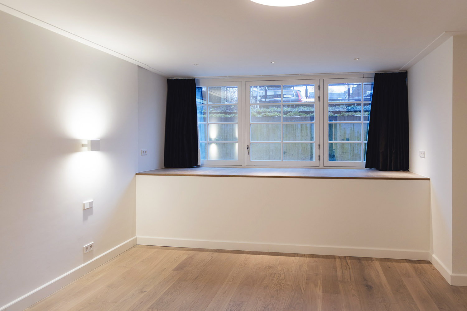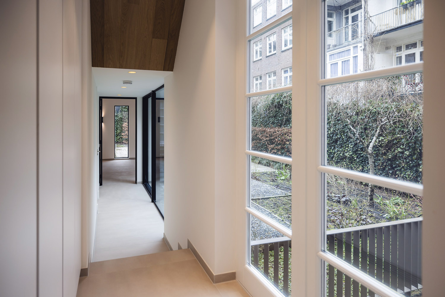 Entrance on the ground floor. Hall with toilet, cloakroom and open wooden staircase to the souterrain. The hall gives access to both kitchen and living room. The spacious and bright living room has a beautiful view over the green and water of the Noorder Amstelkanaal. Wooden and glass double doors open to the large kitchen/dining room.