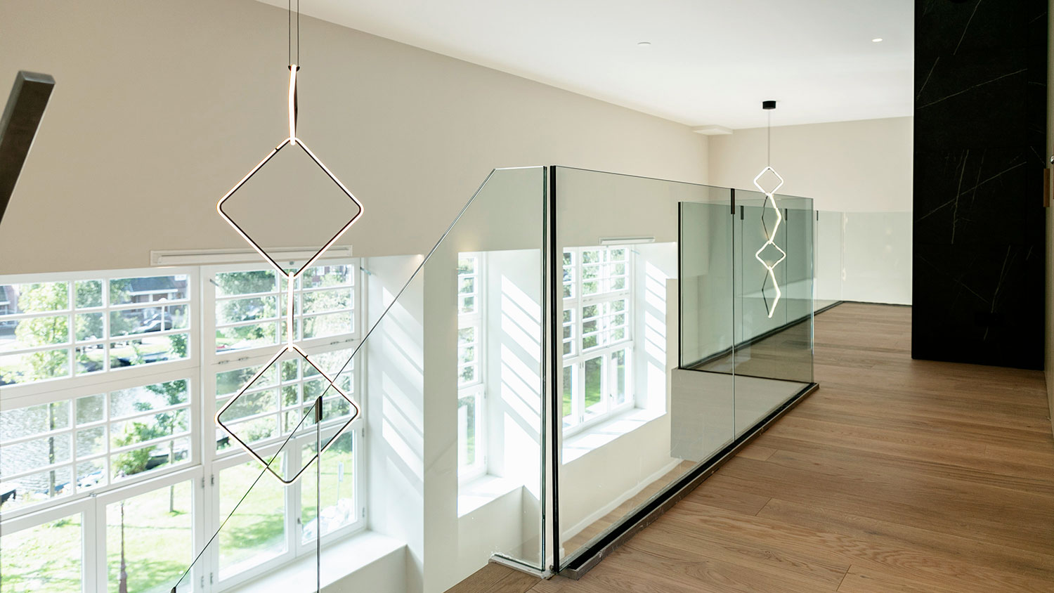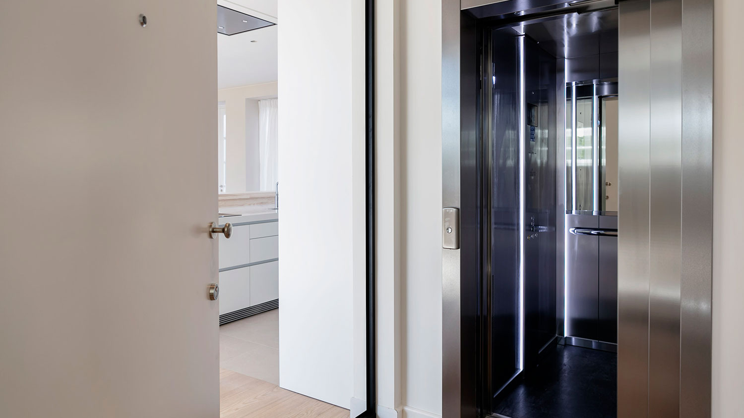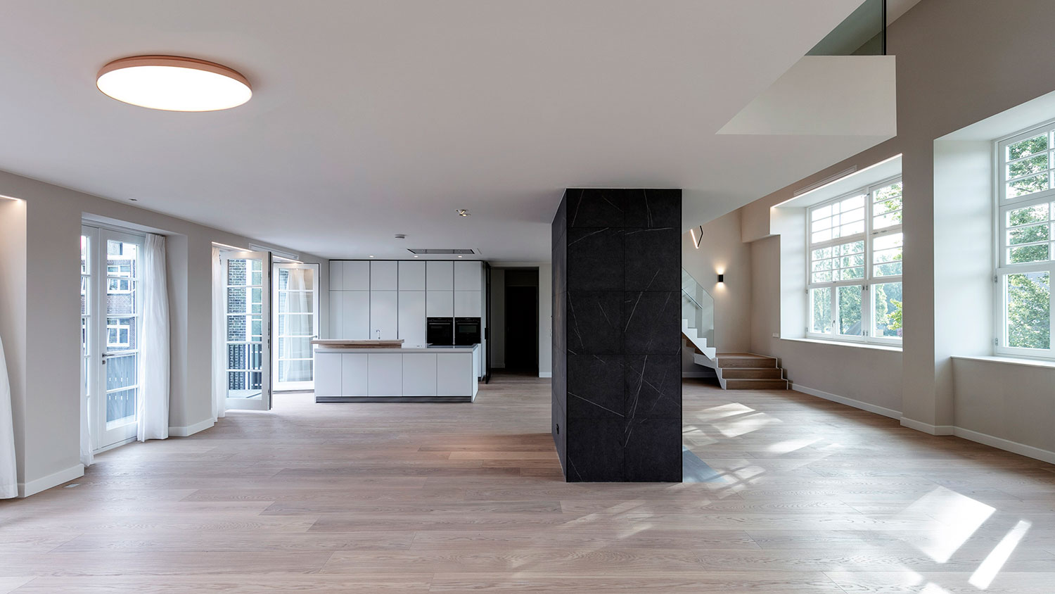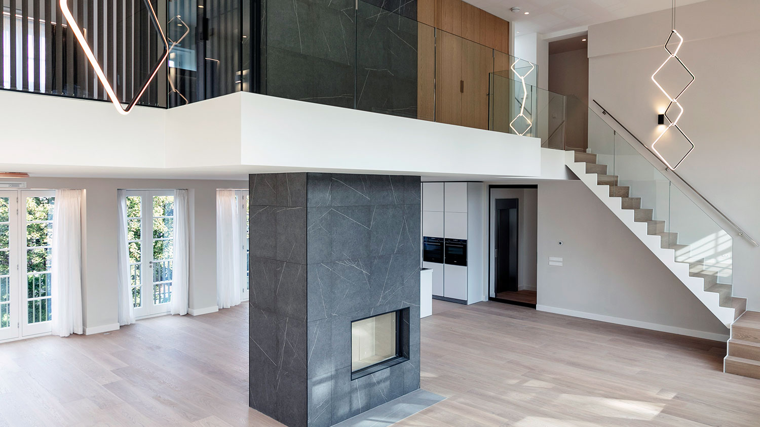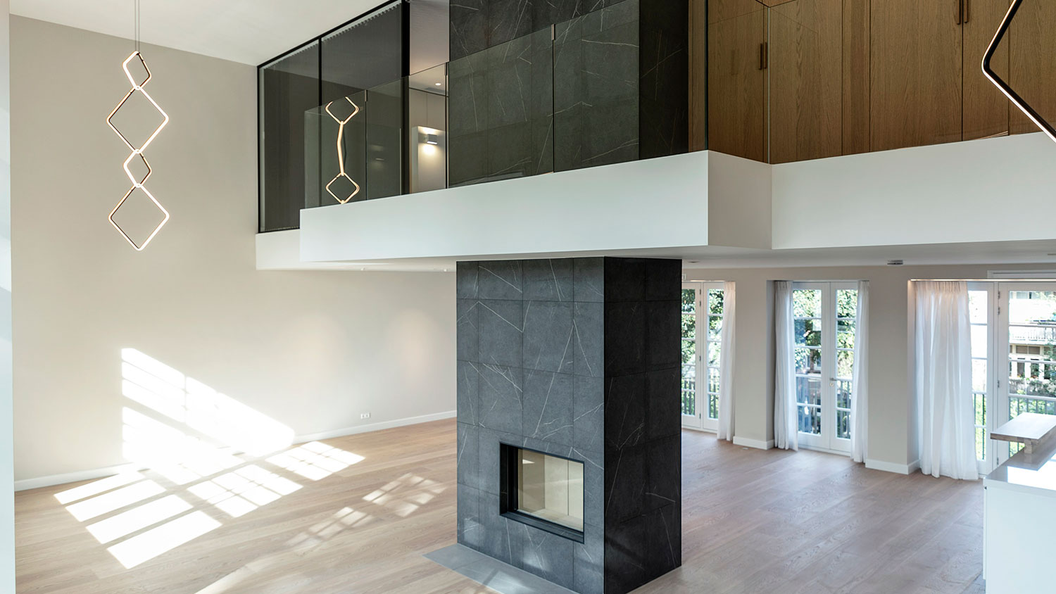 The tastefully decorated common entrance leads to the elevator which gives access to the apartment on the second and third floor directly. On the second floor a hallway with toilet, cloakroom and access to the communal staircase. The impressive living room and open kitchen are nicely divided by the stylish black marble wood burning fireplace.