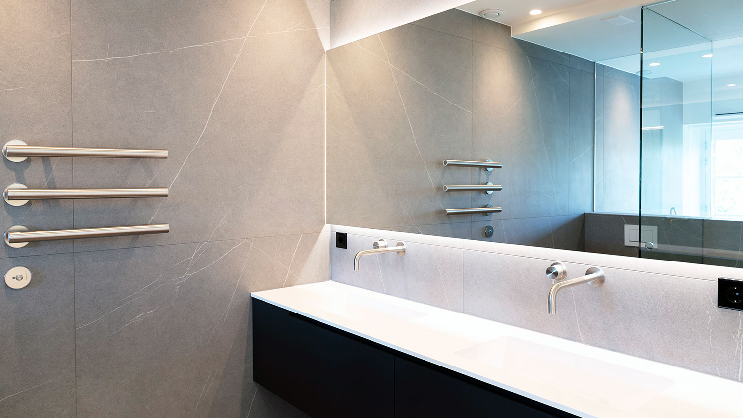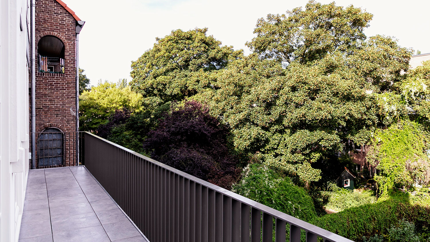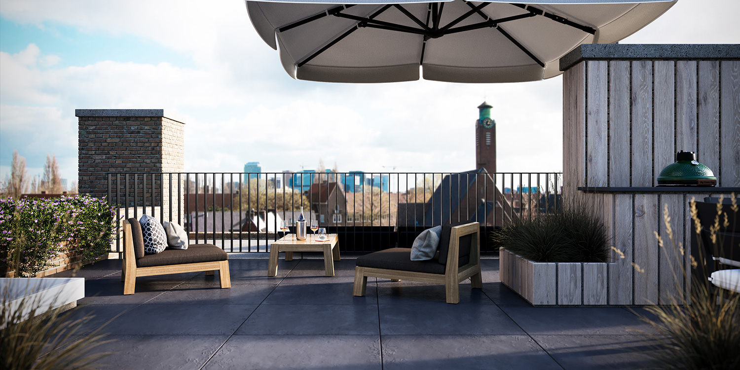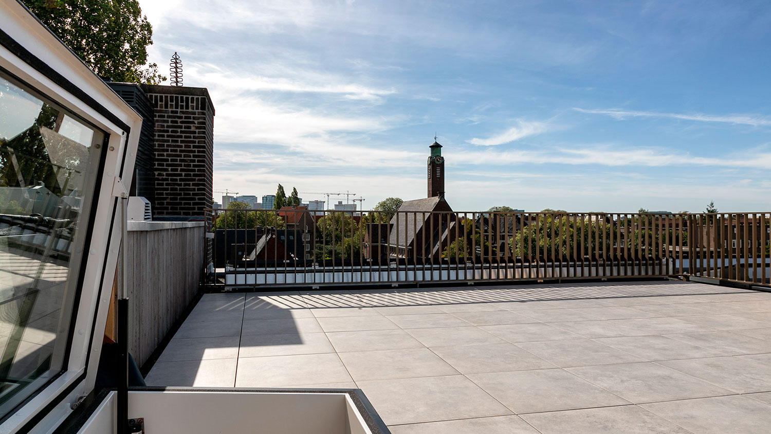 The second bedroom is equipped with a complete bathroom with walk-in shower, wash basin and toilet as well. Both bathrooms are finished with high standard materials such as ceramic tiles of Gigacar and Monolith wash basins. A walk-in closet has been created underneath the staircase that leads to the roof terrace. The terrace is very private yet has a superb view all over Amsterdam.