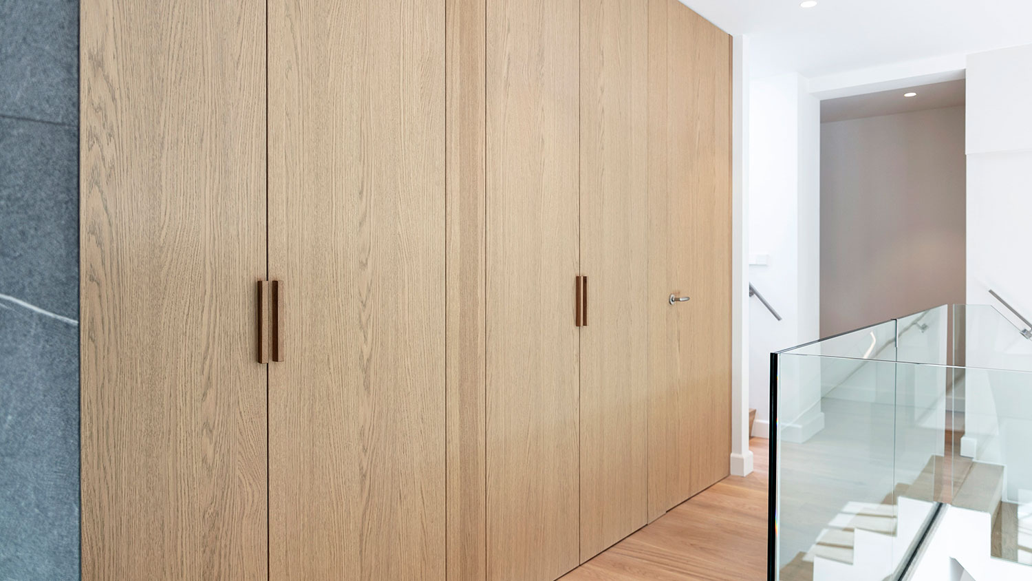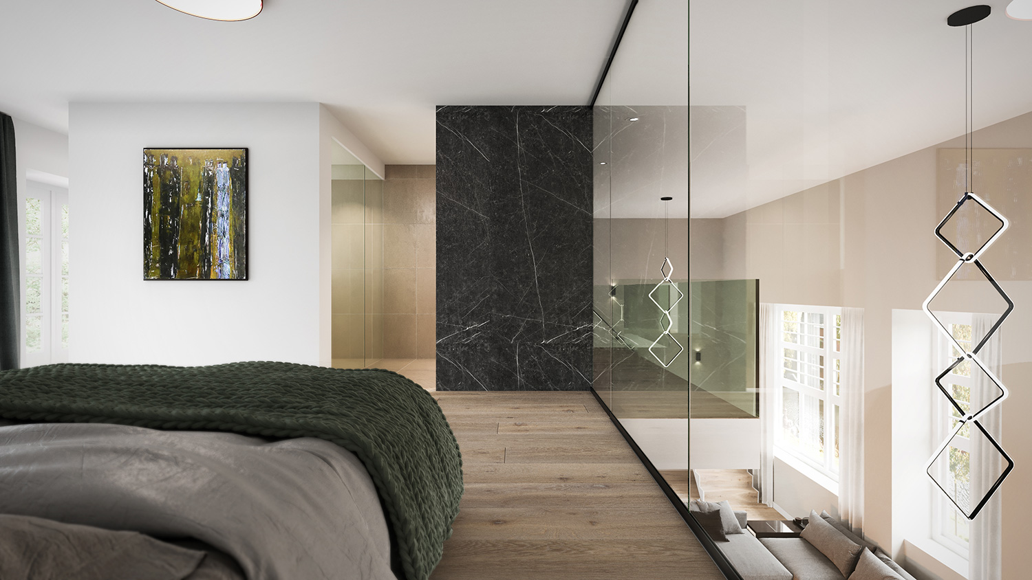 The Bedrooms and bathrooms are situated on the third floor which can be reached both by elevator and by the steel staircase with glass and wooden details situated in the living room. The master bedroom is designed with a huge glass wall overlooking the living. From here the green and water of the Pieter Lastmankade are also visible. The luxurious half open bathroom is equipped with a walk-in shower, toilet, double wash basin and custom made cabinetry. The freestanding bathtub has garden view. A walk-through wardrobe can be found behind the bed.